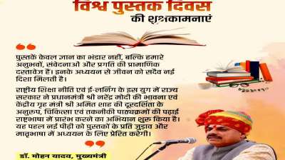 भोपाल: मुख्यमंत्री डॉ. मोहन यादव ने विश्व पुस्तक दिवस पर प्रदेशवासियों को बधाई दी है। उन्होंने आशा व्यक्त की है कि सभी लोग पुस्तक मेले का भरपूर लाभ उठाएंगे। उन्होंने...
