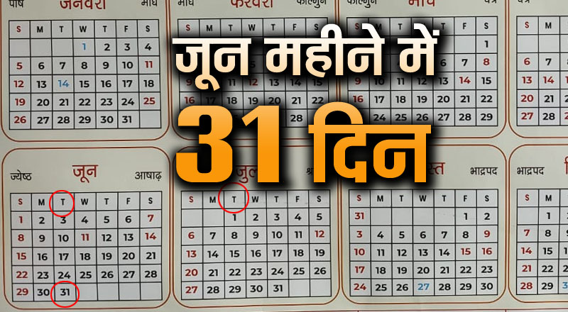 हिमाचल भाजपा के कैलेंडर को देख लोग यह सोच रहे हैं कि जून का महीना तो 30 दिन का होता है, लेकिन कैलेंडर में तो 31 दिन का दिखा रहा है। दरअसल, कैलेंडर की प्रिंटिंग के समय जून महीने को 30 की बजाय 31 दिन का कर दिया गया है। यानी कैलेंडर के हिसाब से 31 जून को मंगलवार है, वहीं जुलाई की पहली तारीख को भी मंगलवार है। ऐसे में यह चर्चा आम हो गई है कि महीना तो 30 का है, फिर भाजपा ने कैसे इसे 31 का कर दिया, क्या कैलेंडर छापते समय किसी से इसकी प्रूफिंग नहीं करवाई गई, या कार्यकर्ताओं को भी यह चूक दिखाई नहीं दी।