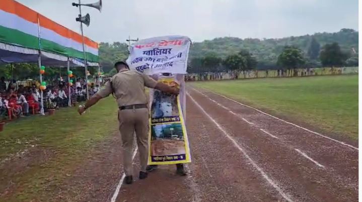 ग्वालियर में स्वतंत्रता दिवस के कार्यक्रम के दौरान आज हंगामा खड़ा हो गया। कार्यक्रम में मौजूद एक व्यक्ति शहर की खराब सड़कों को लेकर प्रदर्शन करने के लिए पहुंच गया। कार्यक्रम में जब मंत्री नारायण सिंह कुशवाह का भाषण चल रहा था, इस दौरान ही युवक विजय माहोर नाम का व्यक्ति अपने शरीर पर ग्वालियर शहर की गड्ढे वाली सड़कों से निजात दिलाने के पोस्टर लगाकर पहुंच गया।आनन-फानन में वहां मौके पर मौजूद पुलिसकर्मियों ने उसे पकड़ लिया। विजय माहौर का कहना था कि ग्वालियर शहर की एक भी सड़क ऐसी नहीं है, जो गड्ढा मुक्त हो. इस तरह के हालात ग्वालियर शहर में है। यह एक दिन की नहीं, बल्कि महीनों से लगातार ग्वालियर शहर की सड़कें खराब हैं। कई बार प्रदर्शन की लेकिन किसी ने नहीं सुना. इस तरह का प्रदर्शन विधानसभा चलने के दौरान विधानसभा के गेट के बाहर भी किया था, लेकिन जनप्रतिनिधियों पर कोई फर्क नहीं पड़ता है।
