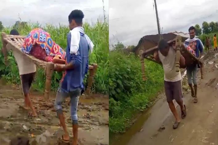 सड़क न होने से खटिया पर ले जाई गई प्रसव पीड़ित महिला