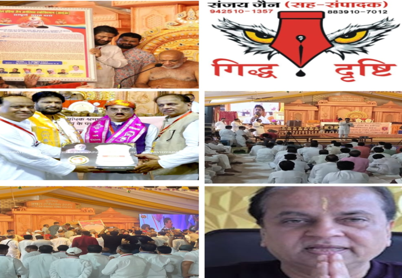 झाबुआ। संजय जैन-सह संपादक। पूज्य सुधा सागरजी महाराज के सानिध्य में और आईजा मप्र के अध्यक्ष राजीव सैनानी के नेतृत्व में छठवां ऑल इंडिया जैन जर्नलिस्ट एसोसिएशन (आईजा) का अद्भुत और गरिमामय राष्ट्रीय सम्मेलन का आयोजन परम पूज्य आध्यात्मिक संत निर्यापक श्रमण मुनि पुंगव श्री सुधासागर जी महाराज, क्षुल्लक गंभीर सागर जी महाराज,क्षुल्लक श्री वरिष्ठ सागर जी महाराज और क्षुल्लक श्री विदेह सागर जी महाराज के सानिध्य में रविवार 5 अक्टुबर की दोपहर सुभाष गंज मैदान में हुआ। इस दौरान आईजा द्वारा परम पूज्य आध्यात्मिक संत निर्यापक श्रमण मुनि पुंगव श्री सुधासागर जी महाराज को राष्ट्रसंत की उपाधि से अलंकृत किया गया और पधारे अतिथियों का सम्मान किया गया।