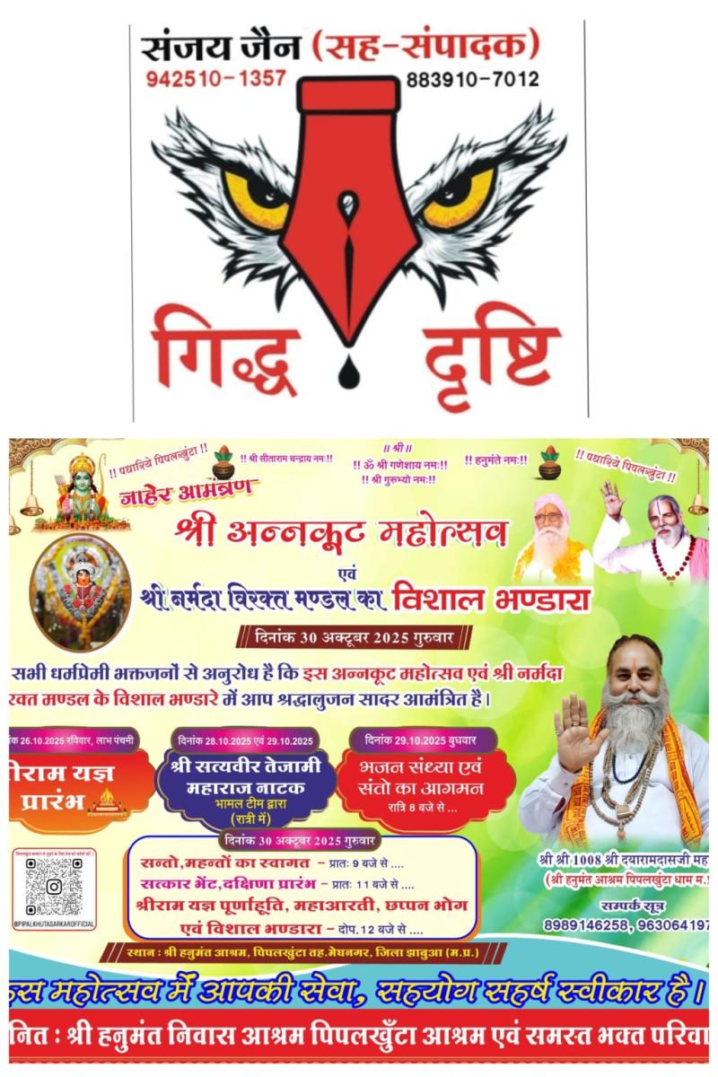 थांदला।कमलेश जैन। श्री हनुमंत निवास आश्रम पिपलखुटा व श्री नर्मदा विरक्त मण्डल द्वारा सिद्ध क्षेत्र पिपलखुटा में तीन दिवसीय भक्तिमय आयोजन किया जा रहा है। जानकारी देते हुए मंदिर के महंत 1008 श्री दयारामदासजी महाराज ने बताया कि कल 26 अक्टोबर लाभ पंचमी के दिन श्रीराम यज्ञ के साथ आयोजन की शुरुआत की गई। आज 28 व कल 29 अक्टोबर को भामल टीम द्वारा सत्यवीर तेजाजी महाराज के नाटक का मंचन किया जाएगा। 29 अक्टोबर को रात्रि में विशाल भजन संध्या का आयोजन एवं संतो और महात्माओं का आगमन भी होगा। 30 अक्टोबर को विभिन्न स्थानों से आने वालें संतों का सत्कार एवं सम्मान भेंट देकर किया जाएगा। साथ ही इसी दिन प्रातःकाल सभी संतों व गुरुभक्तों की उपस्थिति में श्रीराम यज्ञ की पूर्णाहुति के साथ भगवान को छप्पन भोग अर्पण कर दोपहर 12 बजे महा आरती के पश्चात अन्नकूट व विशाल भण्डारें का आयोजन भी किया जाएगा। आयोजन समिति ने सभी धार्मिक आयोजन में उपस्थित होकर सभी भक्तों से धर्मलाभ लेने का निवेदन किया है।