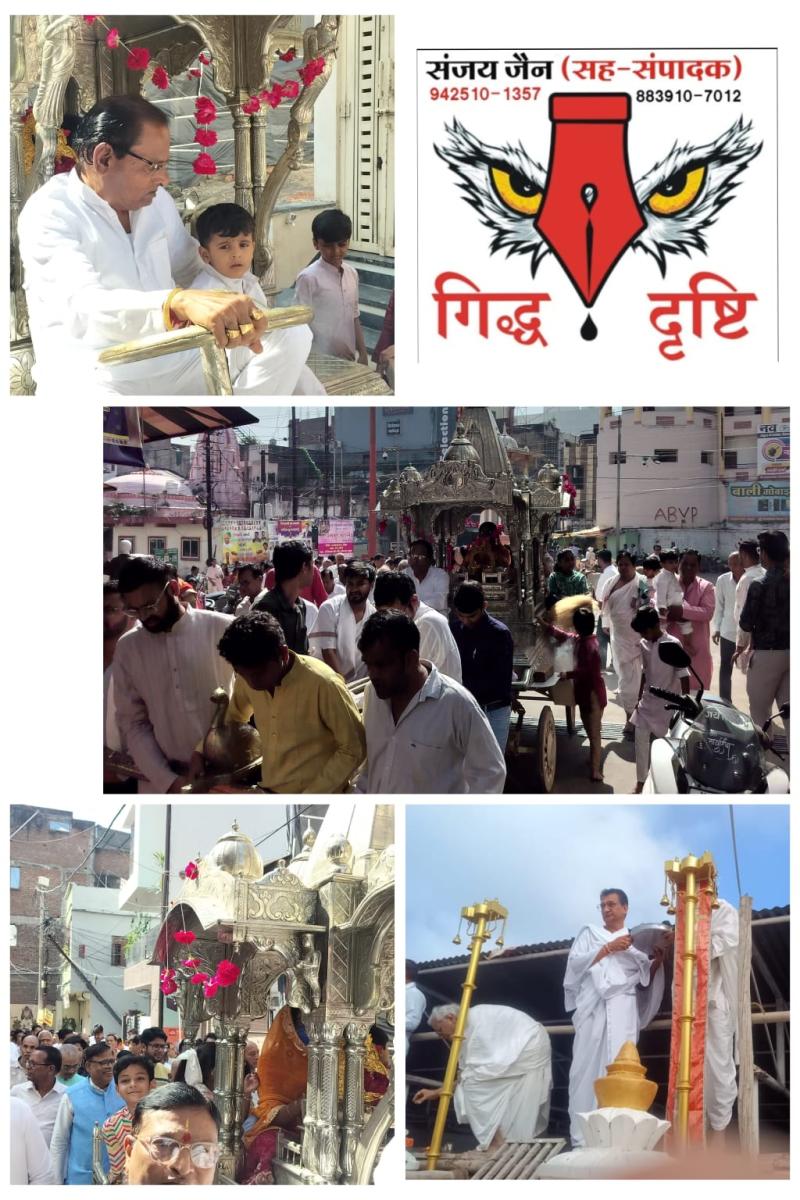 4-प्रातः 10 बजे प्रभुजी की रथयात्रा गाजे बाजे के साथ बावन जिनालय से प्रारंभ होकर नगर के मुख्य मार्गो से भृमण करते हुए पुनः बावन जिनालय पर पहुची।
