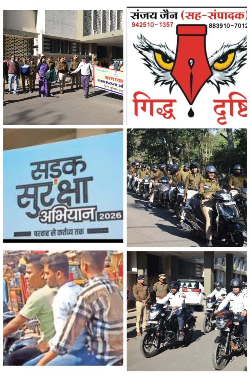 झाबुआ। संजय जैन-सह संपादक। प्रदेश में यातायात सुरक्षा सप्ताह आमतौर पर हर साल जनवरी के दूसरे या तीसरे सप्ताह-11 से 17 जनवरी के आसपास आयोजित किया जाता है। वैसे ही इस दिनांक के अलावा अन्य दिनांक या माह भी आयोजित किया जाता है,इसका उद्देश्य लोगों को यातायात नियमों हेलमेट,सीटबेल्ट,ओवरस्पीडिंग के प्रति जागरूक करना और दुर्घटनाओं को कम करना होता है। इस दौरान पुलिस जागरूकता रैली, नुक्कड़ नाटक और चालान अभियान चलाती है। लेकिन अधिकतर हर साल अभियान के दौरान यातायात माह के साथ ही औपचारिकताओं का दौर शुरू हो जाता है। आला अफसर केवल मात्र उद्घाटन और समापन पर ही अभियान में शरीक होते देखे जाते है।